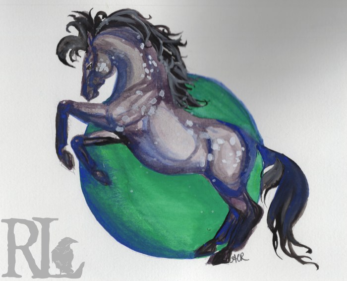 Paint is funny. Colors come from mostly the same selection of sources, what changes is the binder. And that binder makes SO MUCH difference. Gouache is more opaque than watercolor, but shares some of my favorite features in that you can wet and reuse after its dried. This piece, the rearing rose gray, is me trying to get a better grasp on layering and start to mess with mixing wet paint again. With my watercolors, I have gotten so absorbed in my many little trays that I forget to mix the colors while they are wet. (Can you tell the horse is free-hand with no reference picture? I can :-P). I appreciate the way white gouache behaves. Makes dapples easy.